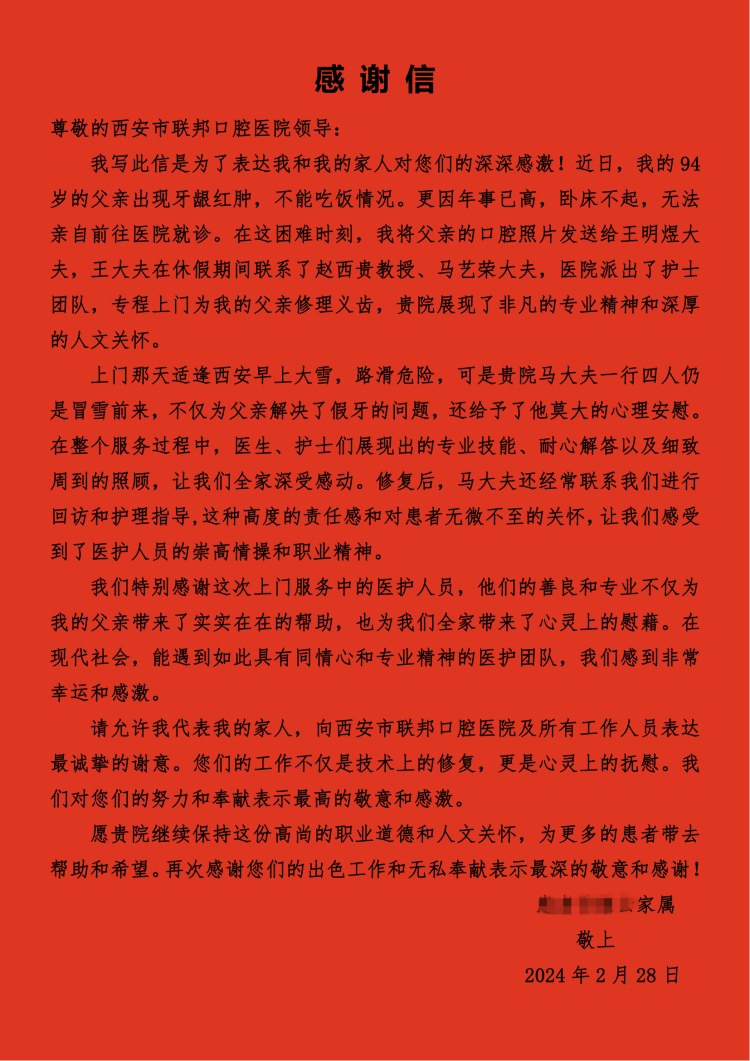 2024年3月16日上午,西安聯(lián)邦口腔醫(yī)院收到一封來(lái)自患者家屬的感謝信,字里行間表達(dá)了對(duì)醫(yī)務(wù)人員的感激,對(duì)優(yōu)質(zhì)服務(wù)的贊揚(yáng)、感動(dòng)和認(rèn)可,傳遞著雙向奔赴的濃濃醫(yī)患情!