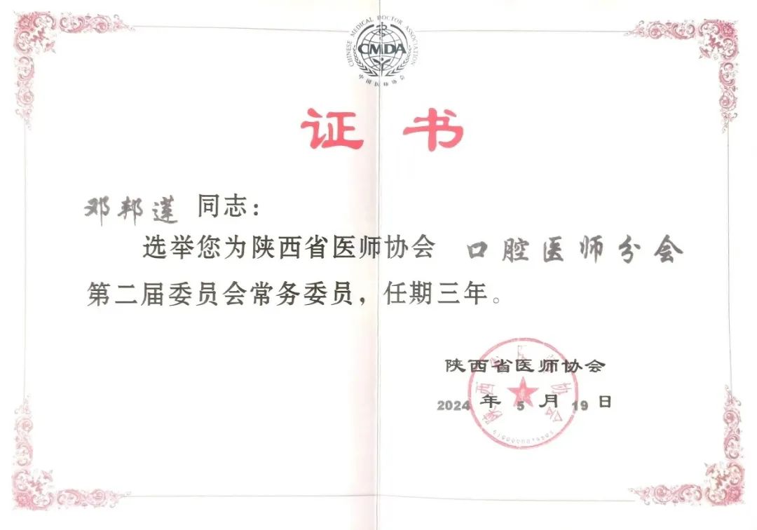 2024年5月19日,陜西省醫(yī)師協(xié)會在西安交通大學口腔醫(yī)院舉辦口腔醫(yī)師分會換屆選舉會暨2024學術會議,西安聯(lián)邦口腔醫(yī)院鄧邦蓮院長當選為陜西省醫(yī)師協(xié)會口腔醫(yī)師分會第二屆委員會常務委員。