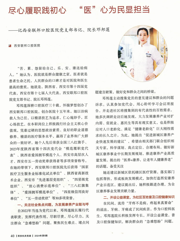 西安聯(lián)邦口腔醫(yī)院鄧邦蓮院長事跡登上“西安機關(guān)黨建”雜志