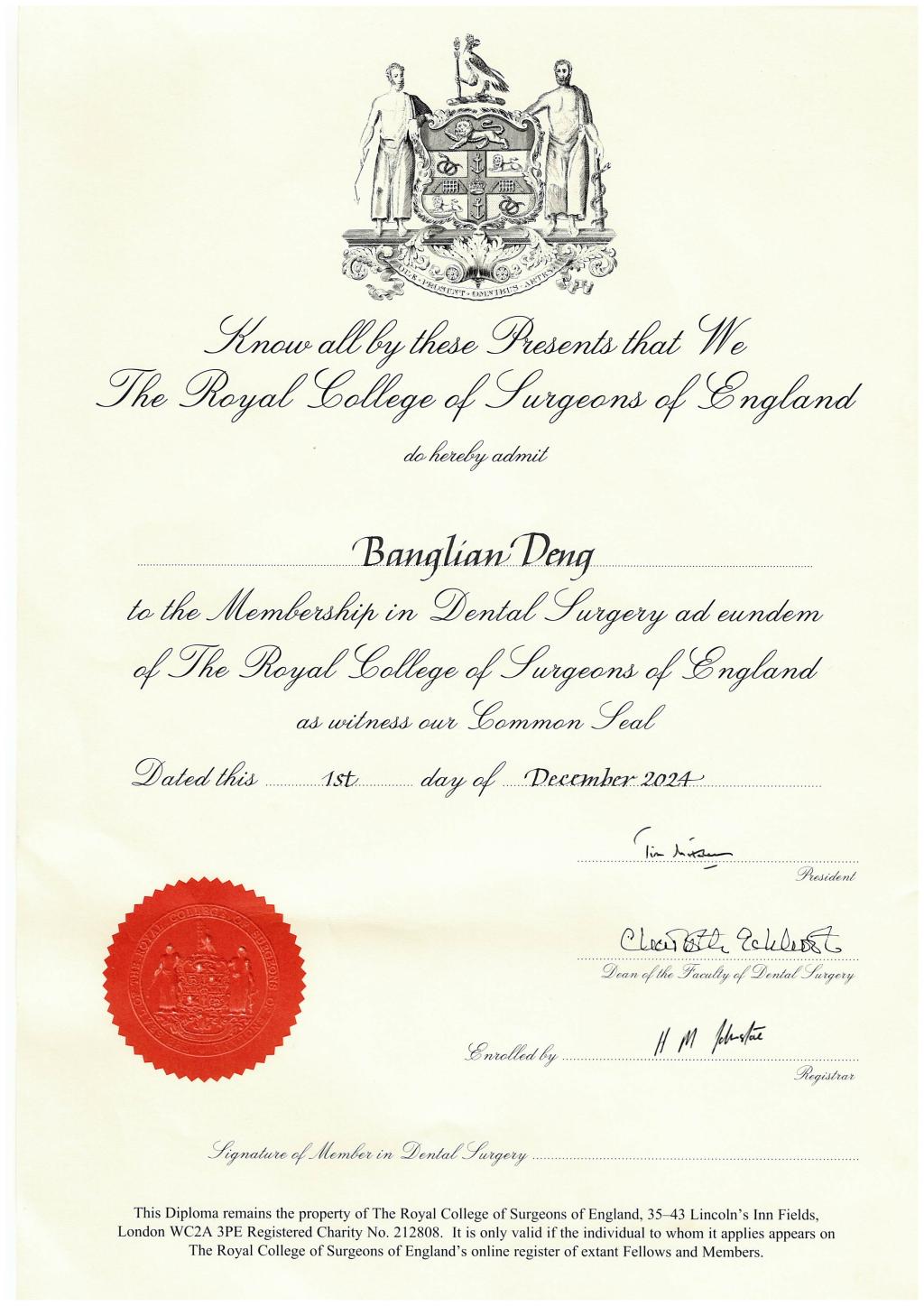 在授勛儀式上,鄧邦蓮院長正式獲得了在國際口腔醫(yī)學界享有盛譽的MFDS專業(yè)資格認證,這是她多年來在口腔正畸領域不懈努力和卓越成就的體現(xiàn)。她表示,榮獲英格蘭皇家外科學院正畸專科院士稱號意義非凡,不僅意味著在新春即將到來之際,順利完成了2024年的年度目標,更是在新資質(zhì)的有力加持下,開啟了充滿希望與挑戰(zhàn)的2025年新征程。這份榮譽是對過往工作的高度肯定,是激勵自己不斷前行的動力源泉,更是對未來工作的有力鞭策。今后將以更加飽滿的熱情深耕于口腔醫(yī)療事業(yè),持續(xù)攀登正畸學術的高峰,努力為更多患者提供優(yōu)質(zhì)的正畸治療服務,幫助他們綻放自信的笑容,為口腔健康事業(yè)的發(fā)展貢獻自己更大的力量。
