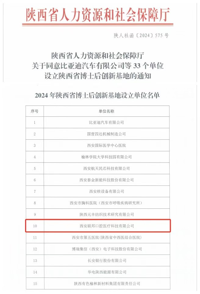 近日,陜西省人力資源和社會(huì)保障廳發(fā)布《關(guān)于同意比亞迪汽車有限公司等33個(gè)單位設(shè)立陜西省博士后創(chuàng)新基地的通知》,西安聯(lián)邦口腔醫(yī)療科技有限公司榜上有名,獲批2024年陜西省博士后創(chuàng)新基地。