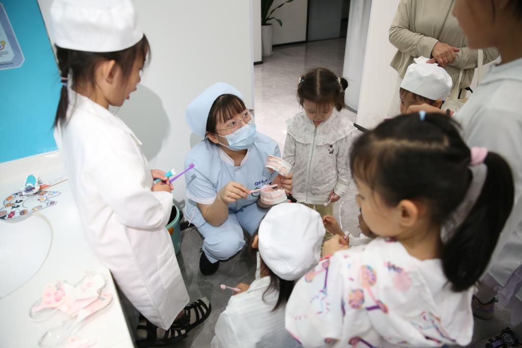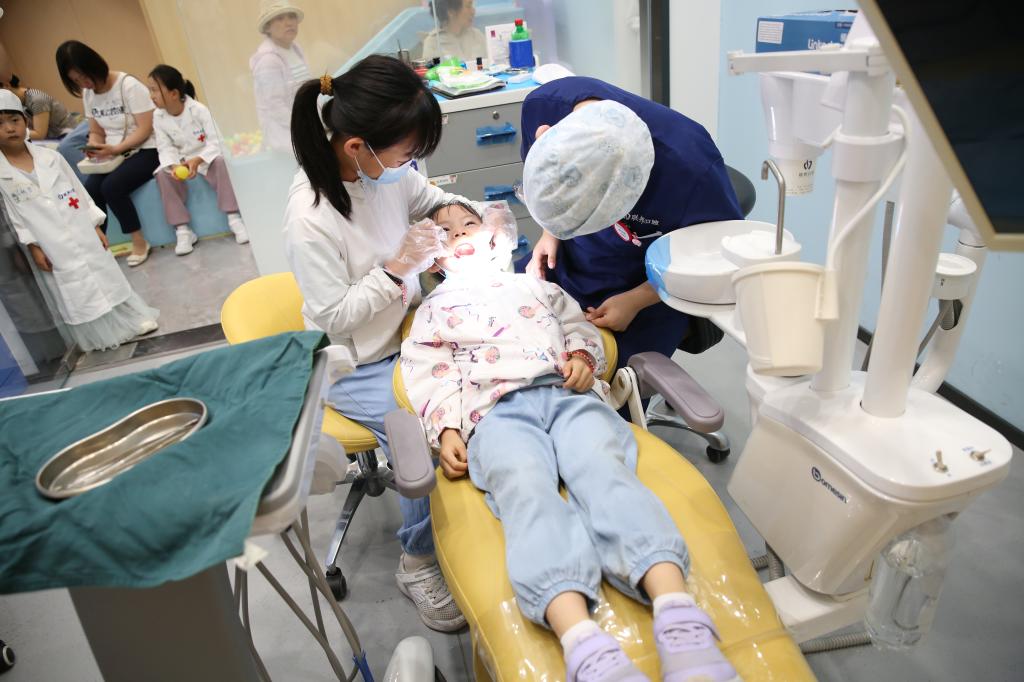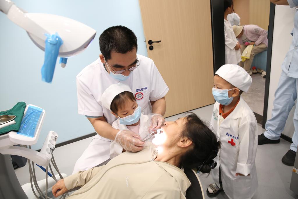 最令人期待的“小小牙醫(yī)”上崗環(huán)節(jié)終于到來,小牙醫(yī)們勇敢地拿起工具,近距離檢查爸爸媽媽的牙齒。家長們?nèi)ε浜希⒆觽冊谔魬?zhàn)中感受到了作為牙醫(yī)的責(zé)任與成就感,整個活動現(xiàn)場充滿了激動與歡樂的氛圍。