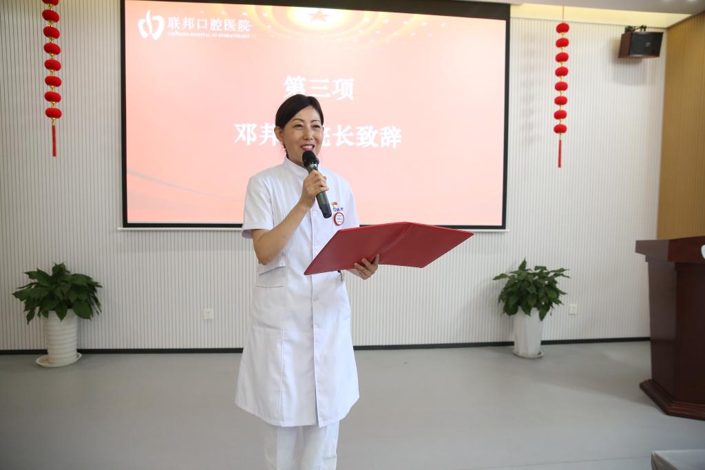 儀式現(xiàn)場播放了醫(yī)院發(fā)展紀(jì)實片,回顧了西安聯(lián)邦口腔醫(yī)院自2009年成立以來,從兩臺椅位,三名員工發(fā)展成為集醫(yī)療、教學(xué)、科研于一體的綜合性口腔醫(yī)療機構(gòu)。醫(yī)院現(xiàn)擁有碑林口腔醫(yī)院、新城口腔醫(yī)院、行政中心口腔醫(yī)院、民樂園口腔醫(yī)院、口腔技術(shù)研究院和瑜伽館六個法人實體,凝聚了一支由40余名第四軍醫(yī)大學(xué)口腔醫(yī)院和西安交通大學(xué)口腔醫(yī)院專家教授領(lǐng)銜的精英團隊,以先進的理念、精湛的醫(yī)術(shù)和溫馨的服務(wù),贏得了廣大患者的信任與贊譽。接著,鄧邦蓮院長發(fā)表了熱情洋溢的致辭,她深情回顧醫(yī)院十六載發(fā)展之路,強調(diào)人才戰(zhàn)略對醫(yī)院高質(zhì)量發(fā)展的重要意義,并對鄧中榮院長的任職致以誠摯歡迎與崇高敬意。她表示:“鄧中榮院長的加入,必將為聯(lián)邦口腔醫(yī)院臨床技術(shù)、科研創(chuàng)新和人才培養(yǎng)注入強大動力?!?/span>
