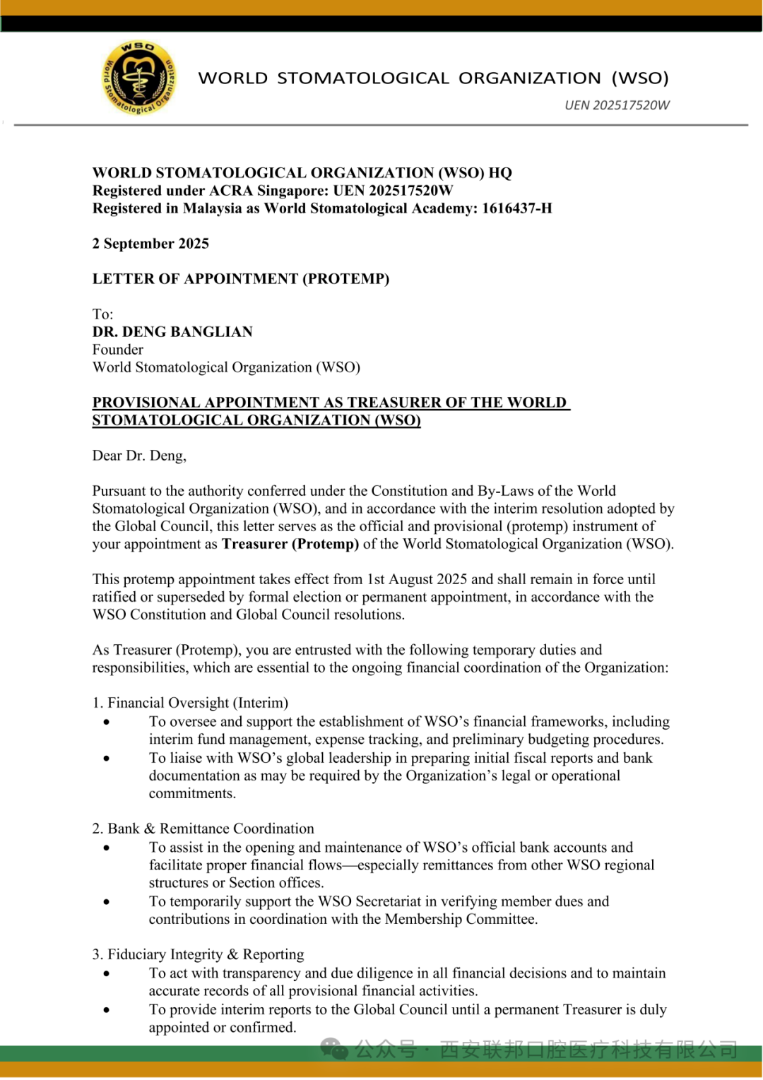 世界口腔醫(yī)學(xué)組織(WSO)財(cái)務(wù)主管臨時委任函