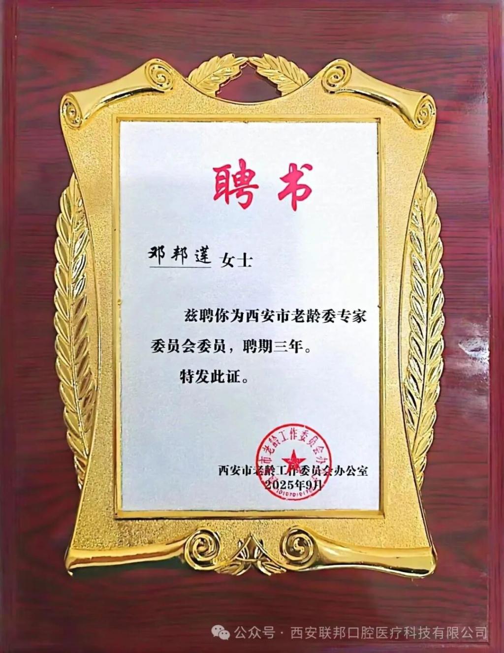 2025年9月5日,西安市老齡委專家委員會成立大會在未央區(qū)學術交流中心隆重召開。西安聯(lián)邦口腔醫(yī)院院長鄧邦蓮博士憑借在老年口腔醫(yī)療領域的專業(yè)積淀與公益實踐,成功當選為西安市老齡委第一屆專家委員會委員。