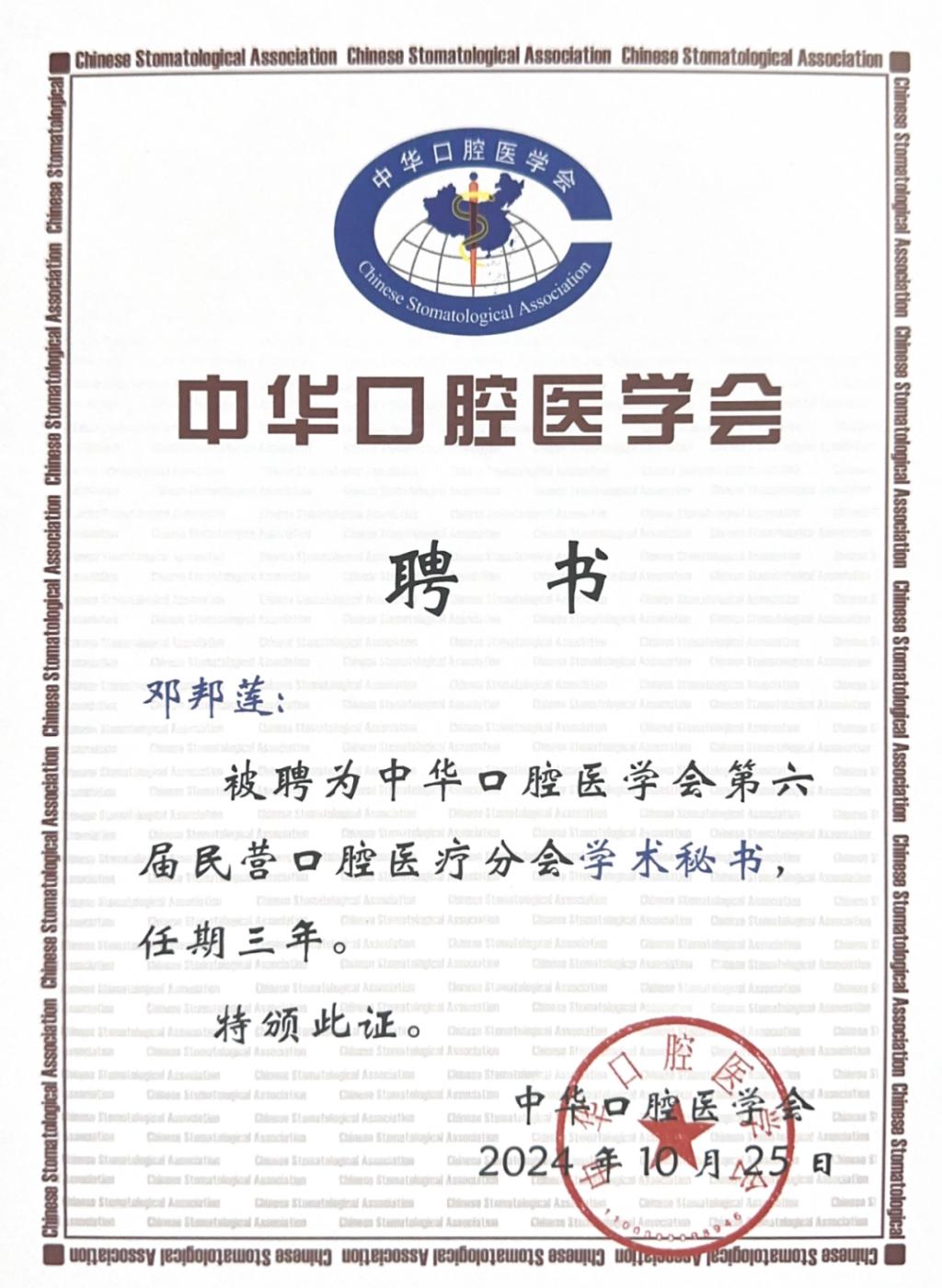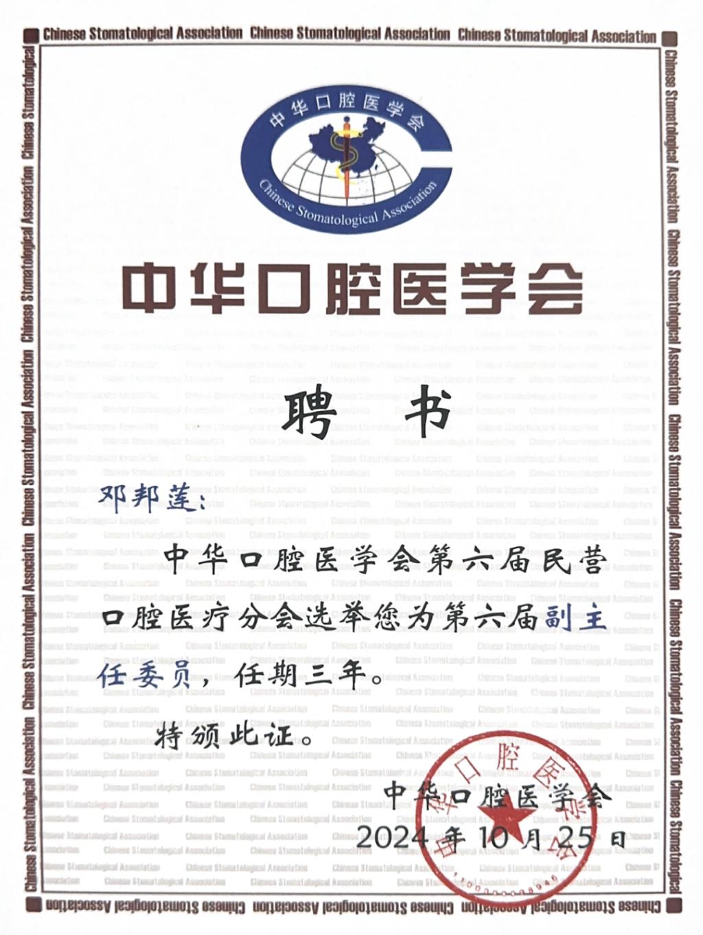鄧邦蓮院長(zhǎng)榮任中華口腔醫(yī)學(xué)會(huì)民營(yíng)醫(yī)療分會(huì)第六屆副主任委員后,深感責(zé)任重大,使命光榮。她表示將與全體同仁齊心協(xié)力做好分會(huì)的各項(xiàng)工作,強(qiáng)化行業(yè)引領(lǐng),促進(jìn)規(guī)范發(fā)展;深化學(xué)術(shù)交流,提升專(zhuān)業(yè)水平;優(yōu)化會(huì)員服務(wù),增強(qiáng)組織凝聚力;聚焦公益行動(dòng),踐行社會(huì)責(zé)任,通過(guò)共享、共創(chuàng)、共贏,共同推進(jìn)我國(guó)民營(yíng)口腔醫(yī)療事業(yè)的繁榮發(fā)展。