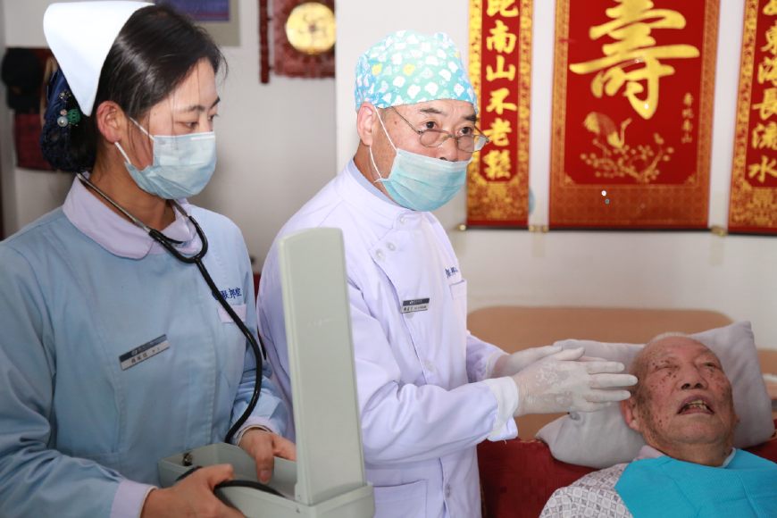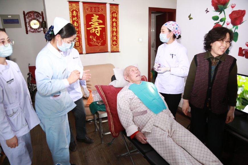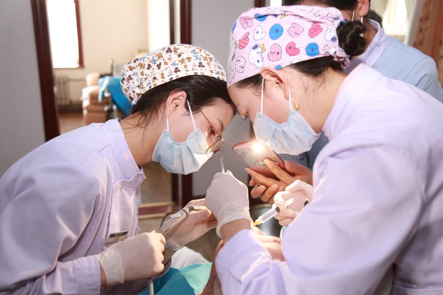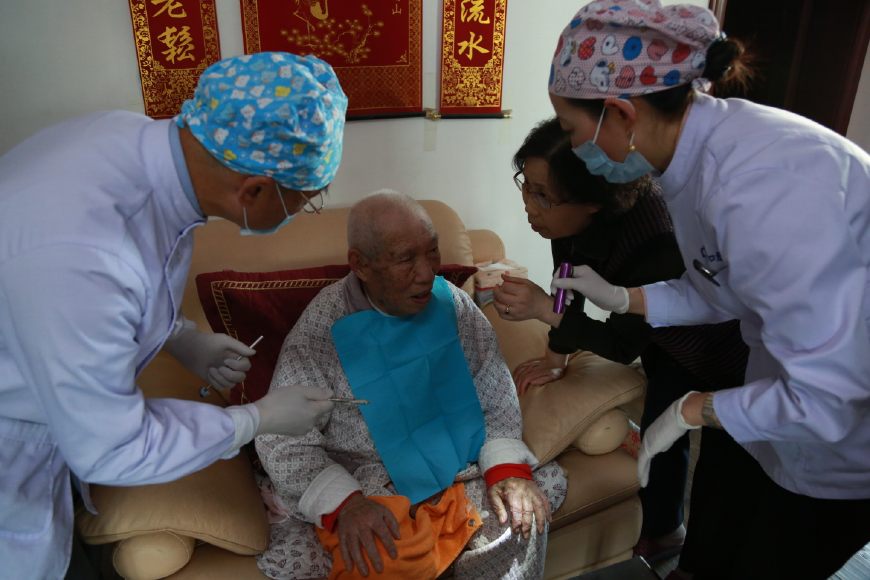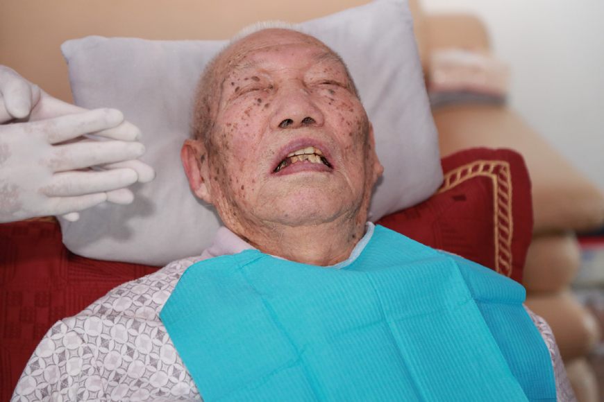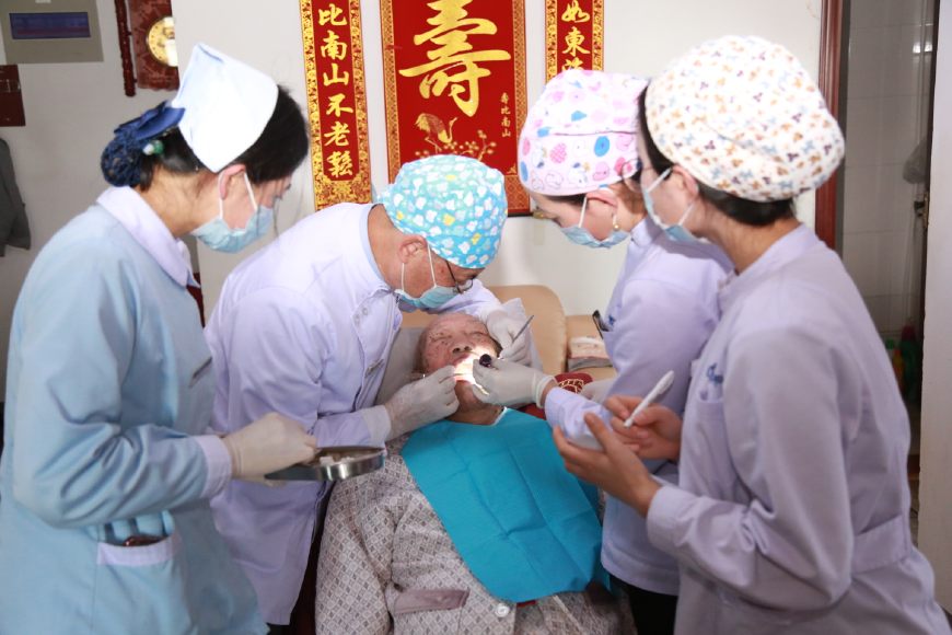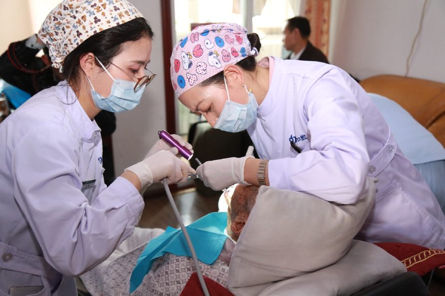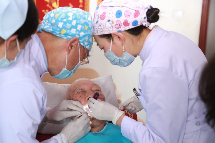楊教授和鄧院長首先給老人做了一個口腔的全面檢查,在女兒的幫助下,老人很配合,檢查后發(fā)現(xiàn),老人由于愛吃糖,平時也不刷牙,局部牙齒已經(jīng)開始爛掉,治療難度非常大。經(jīng)過商量后,采用保守治療,首先開始清洗,為了方便上門給患者服務(wù),醫(yī)院采購了便攜式醫(yī)療床,牙科移動治療機,讓患者減少痛苦,享受和醫(yī)院一樣的治療。